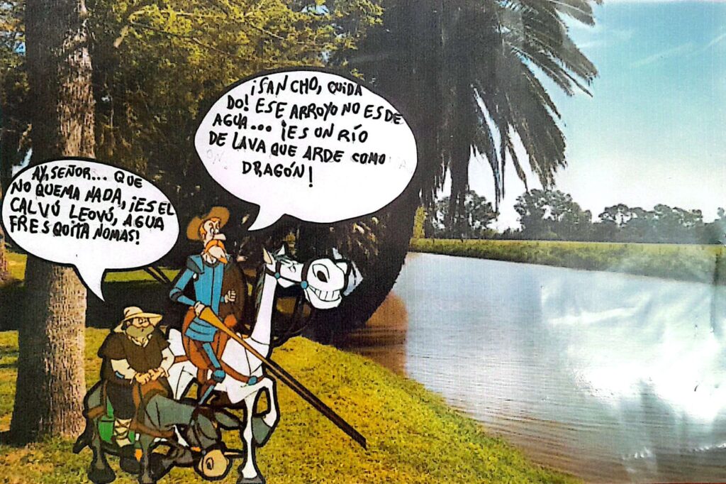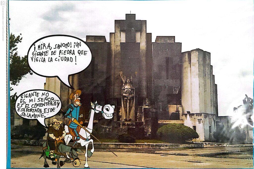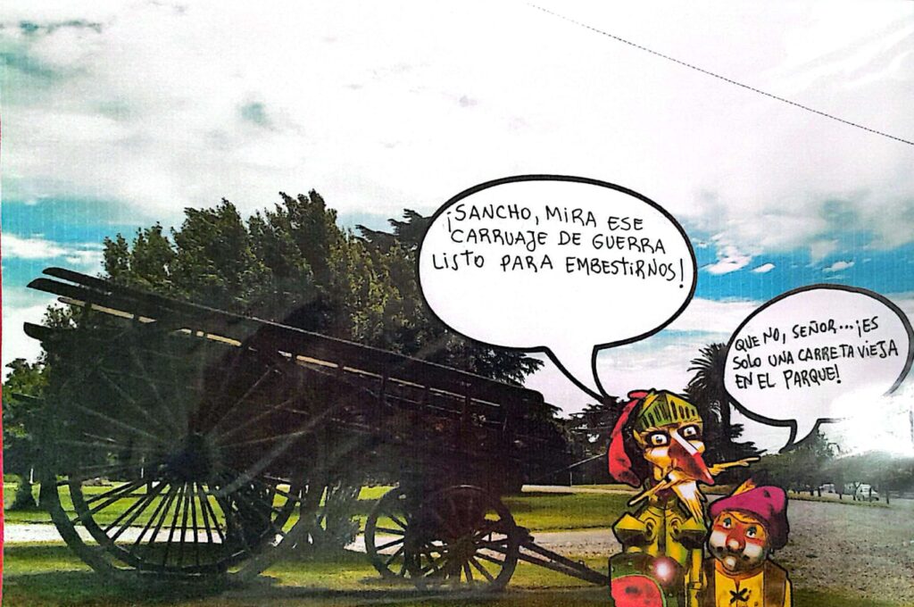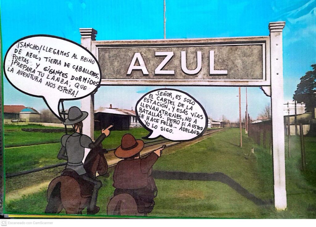 A través de un recorrido por lugares emblemáticos de Azul, se preguntaron: ¿con qué se confundiría Don Quijote si llegara hasta aquí? Así nacieron sus postales intervenidas, donde el caballero y su fiel escudero dialogan frente al ángel del cementerio, las sierras, la Plaza San Martín y otros escenarios cargados de fantasía.